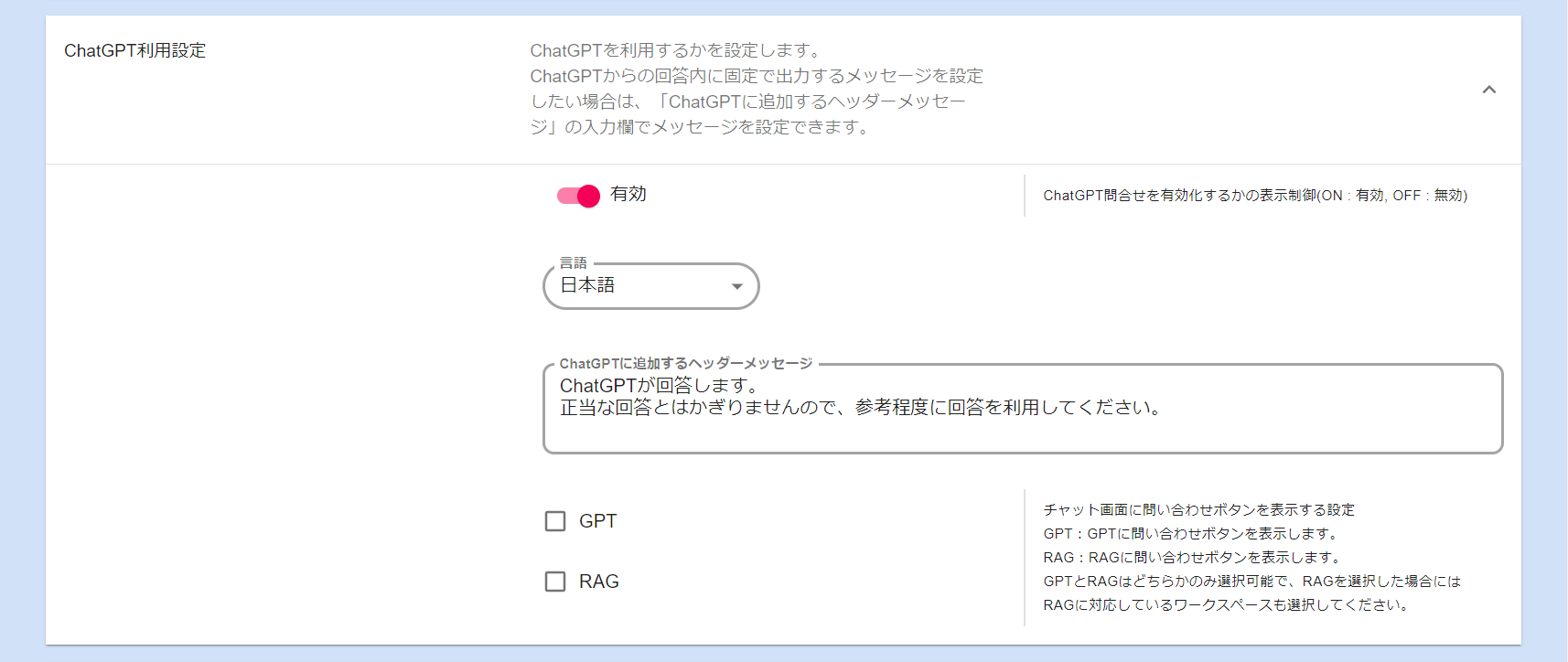 「ChatGPT利用設定」を有効とすることで、チャット画面に問い合わせボタンを表示する設定が表示されます。