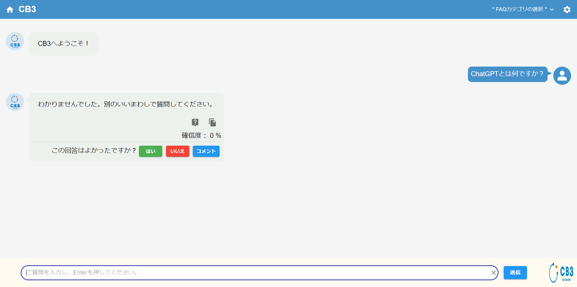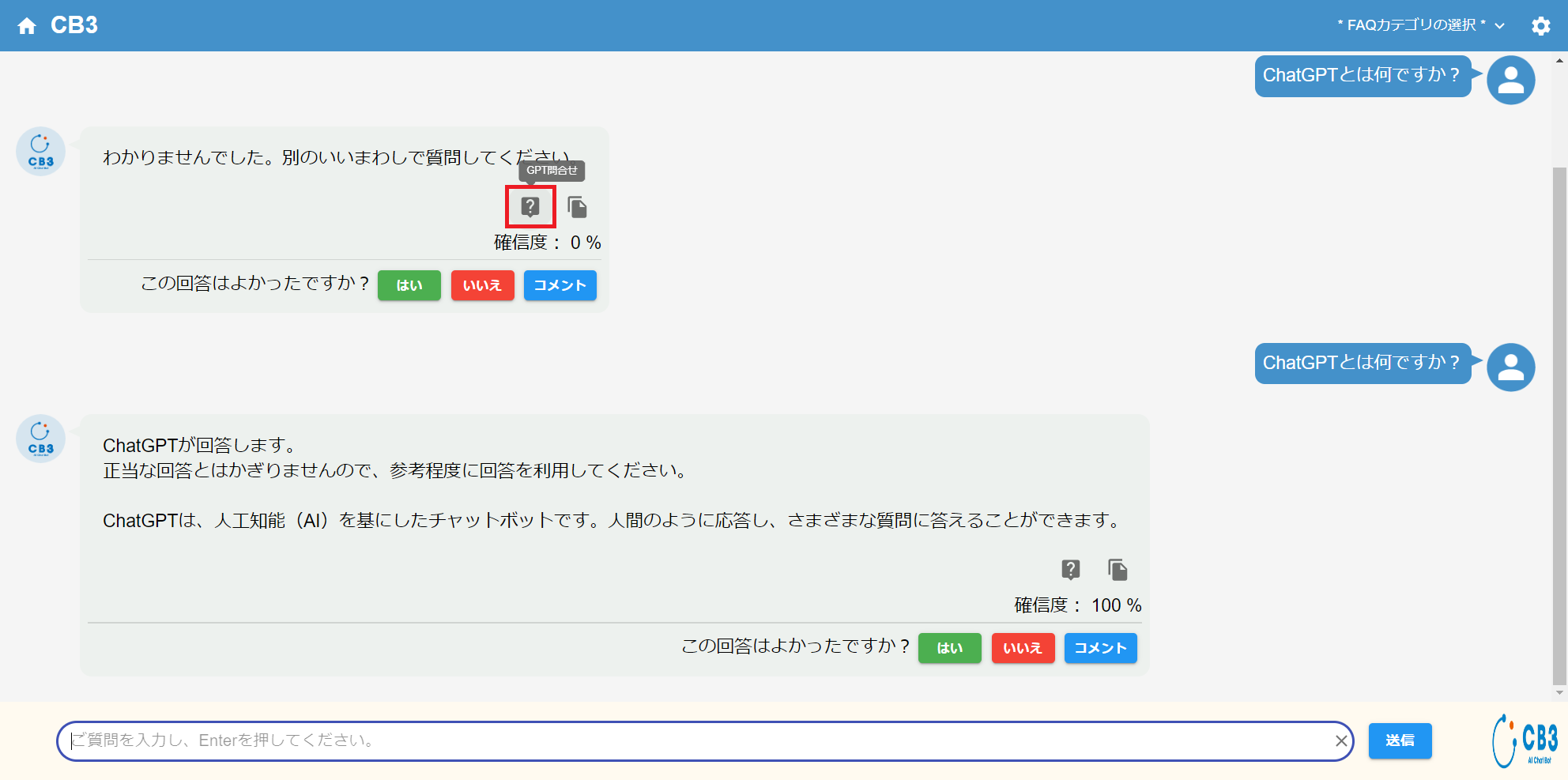 デフォルト回答が返答された場合や、期待した回答内容ではない場合にユーザーがChatGPTに問い合わせを行う事ができます。チャットボットからの回答内に表示される「GPT問合せ」ボタンで問い合わせが可能です。