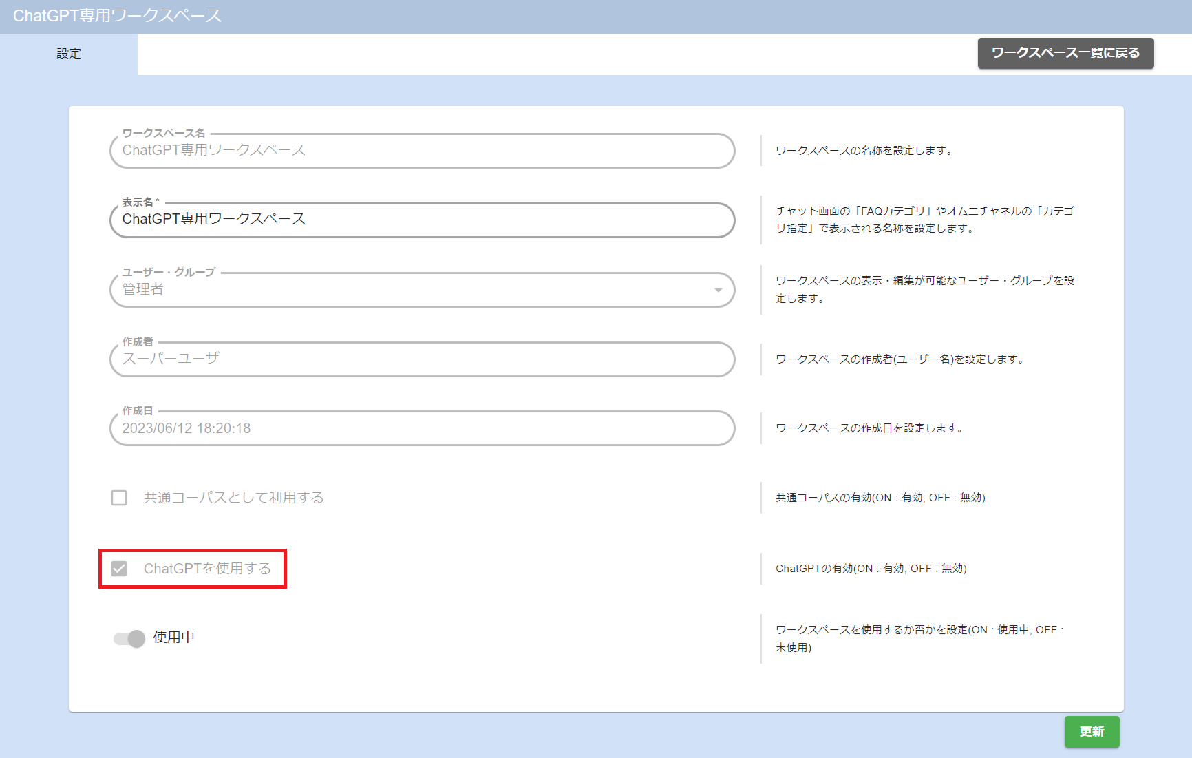 GPT問合せボタンを有効にするには、ワークスペース設定でChatGPT用のワークスペースが使用中設定となっている必要があります。 -