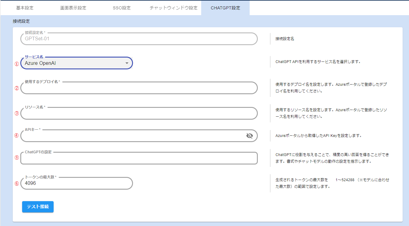 | ⑥ | トークンの最大数 | Azureポータルでデプロイしたモデルのトークンの最大数を入力します。 |
