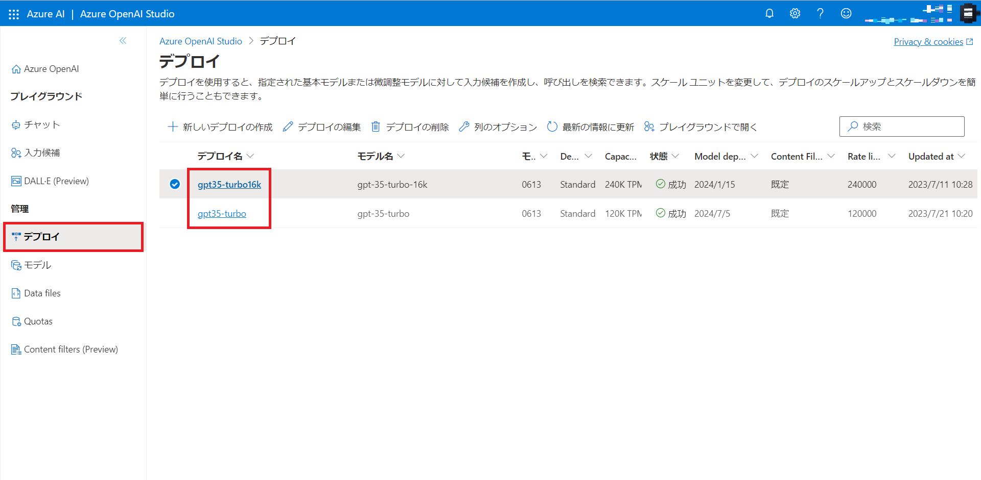 | ② | 使用するデプロイ | Azureポータルで登録したデプロイ名を入力します。 (例:gpt35-turbo) Azure OpenAIについてはgpt-3.5まで動作確認をしていますが、gpt-4については動作未確認です。 |