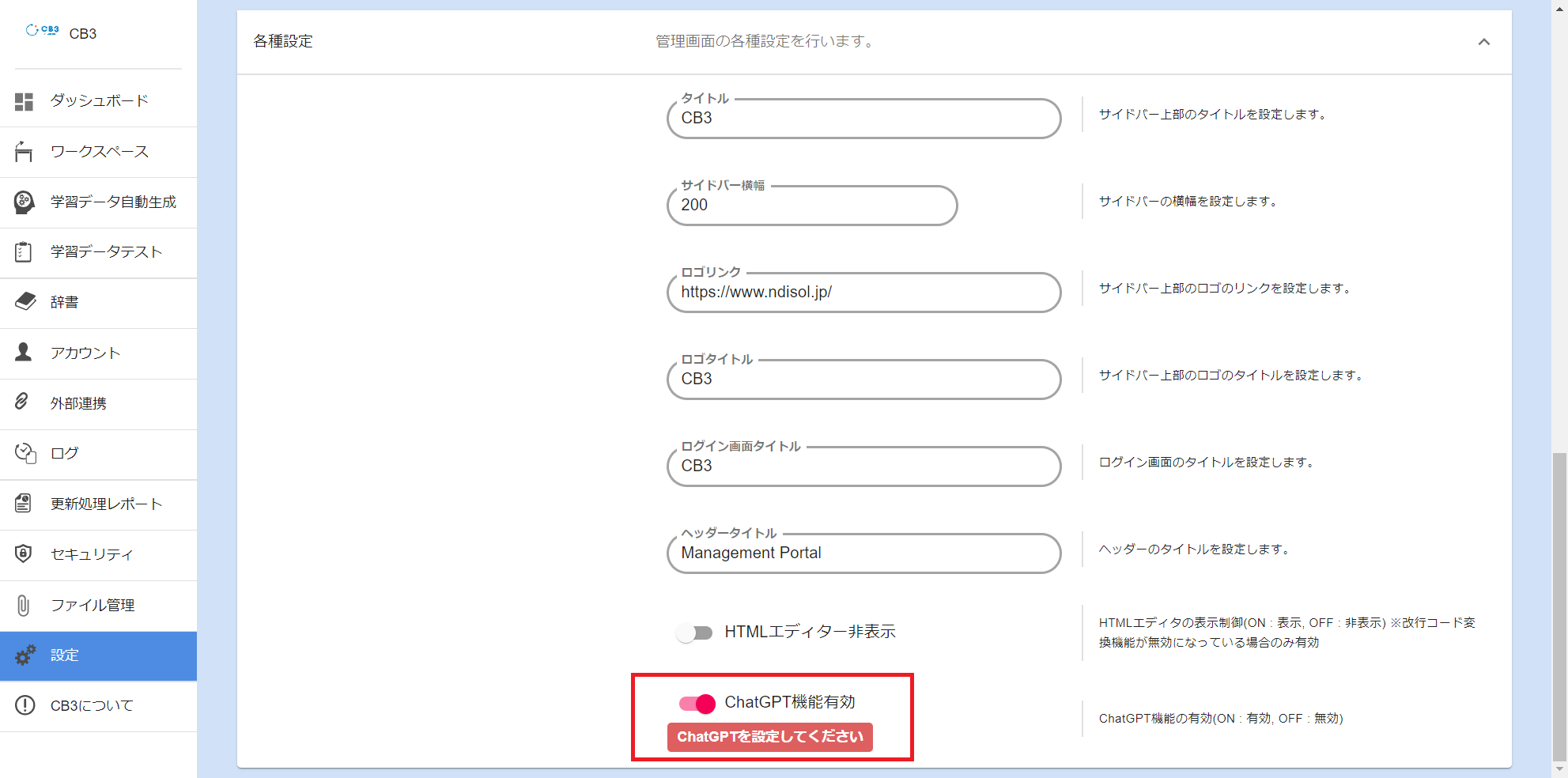 - 「ChatGPT機能」を有効とすることで、ChatGPTを使用する機能を使用することができます。