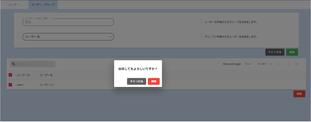 グループから解除したいユーザーをチェックボックスで選択し、削除ボタンをクリックします。