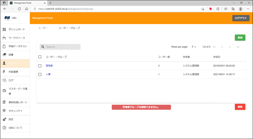 3. 管理者グループから管理者を削除しようとするとエラーとなります。