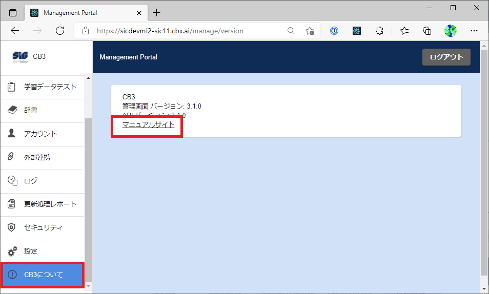 左のサイドメニューから「CB3について」(製品名ごとに異なります)をクリックし、出てきた画面のリンクをクリックするとマニュアルサイトを表示します。